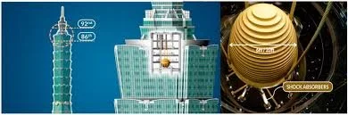 One of the most distinctive features of Taipei 101 is its tuned mass damper system, located between the 86th and 92nd floors. The damper consists of a 726 ton steel pendulum with a diameter of approximately six meters, suspended by high strength cables and connected to hydraulic damping devices. During wind induced or seismic motion, the damper moves out of phase with the building, generating counteracting inertial forces. As the damper oscillates, hydraulic shock absorbers dissipate energy by forcing fluid through small internal orifices, converting kinetic energy into heat. This process reduces vibration amplitude, limits acceleration, and improves occupant comfort.