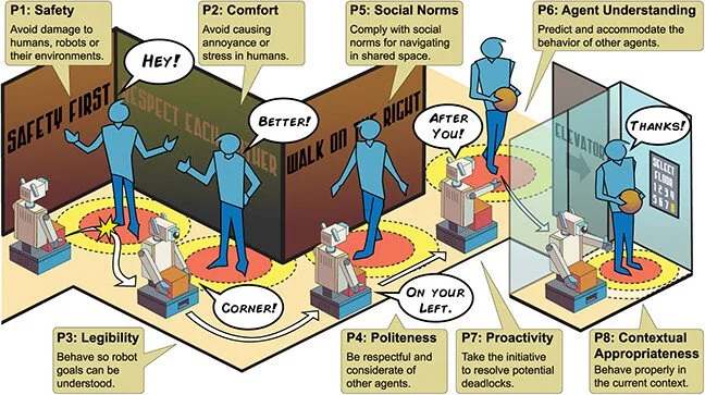 These principles are more than just moral guidelines—they’re optimization goals. In AI terms, you can actually code these behaviors into the robot’s decision-making engine. It’s not just “go from A to B.” It’s “go from A to B in a way that doesn’t annoy people, cause danger, or make humans think you’re a jerk.”